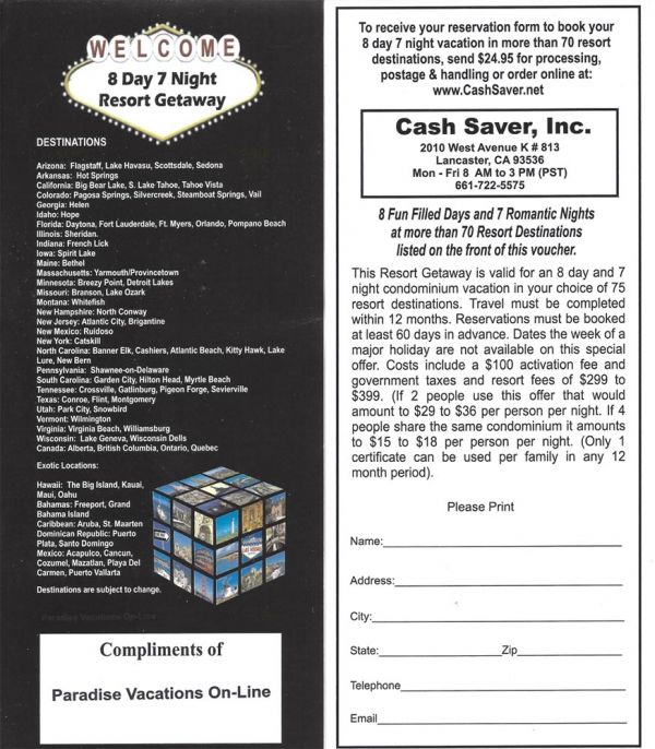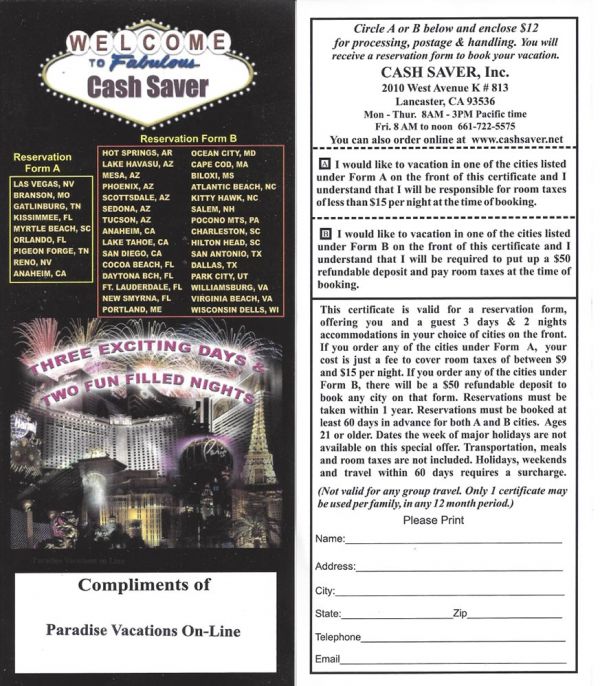 - A: No. You pay $12.00 to redeem your certificate. You will receive your reservation form in about a week from the travel agency that handles the vacation destination you have checked on the certificate. When you send in the reservation form with the requested dates of your vacation, send in the room tax of from $9.00 to $15.00 per night depending on location. That's it.